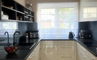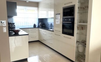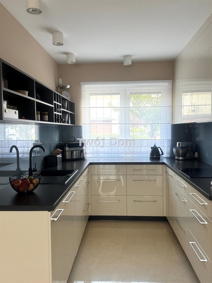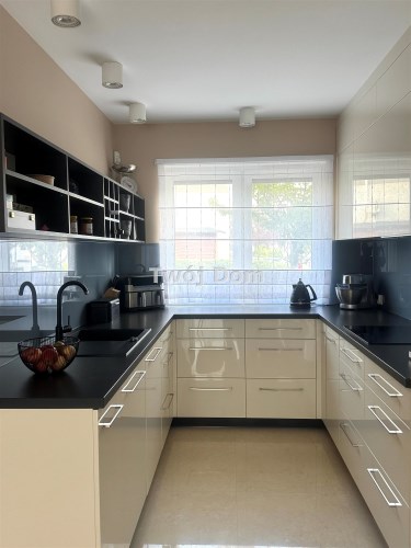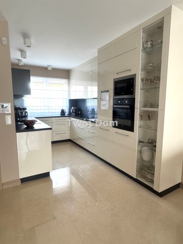 Na parterze znajduje się przedpokój ,łazienka , pomieszczenie gospodarcze ,oraz otwarta kuchnia z salonem . Podłogi na parterze podgrzewane marmurowe. Kuchnia wyposażona w pełni w sprzęt AGD ( lodówka, zmywarka, piekarnik, mikrofalówka, płyta indukcyjna) w zabudowie wykonanej na zamówienie pod wymiar.