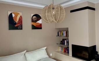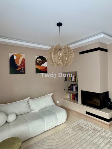 W salonie kominek oraz duże przesuwne okno wychodzące na ogród.
