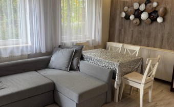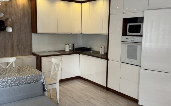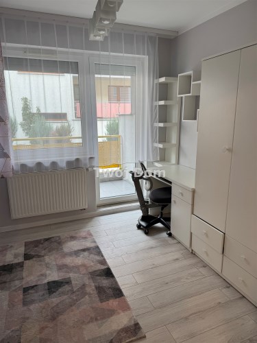 Kuchnia w nowoczesnej zabudowie w pełni wyposażona -lodówka, zmywarka, płyta indukcyjna, okap, mikrofalówka, pralka, telewizor. W łazience i WC nowa armatura .Posiada rolety antywłamaniowe sterowane pilotem. A tyłu budynku znajduje się dodatkowy parking oraz plac zabaw dla dzieci . Blok ogrodzony.